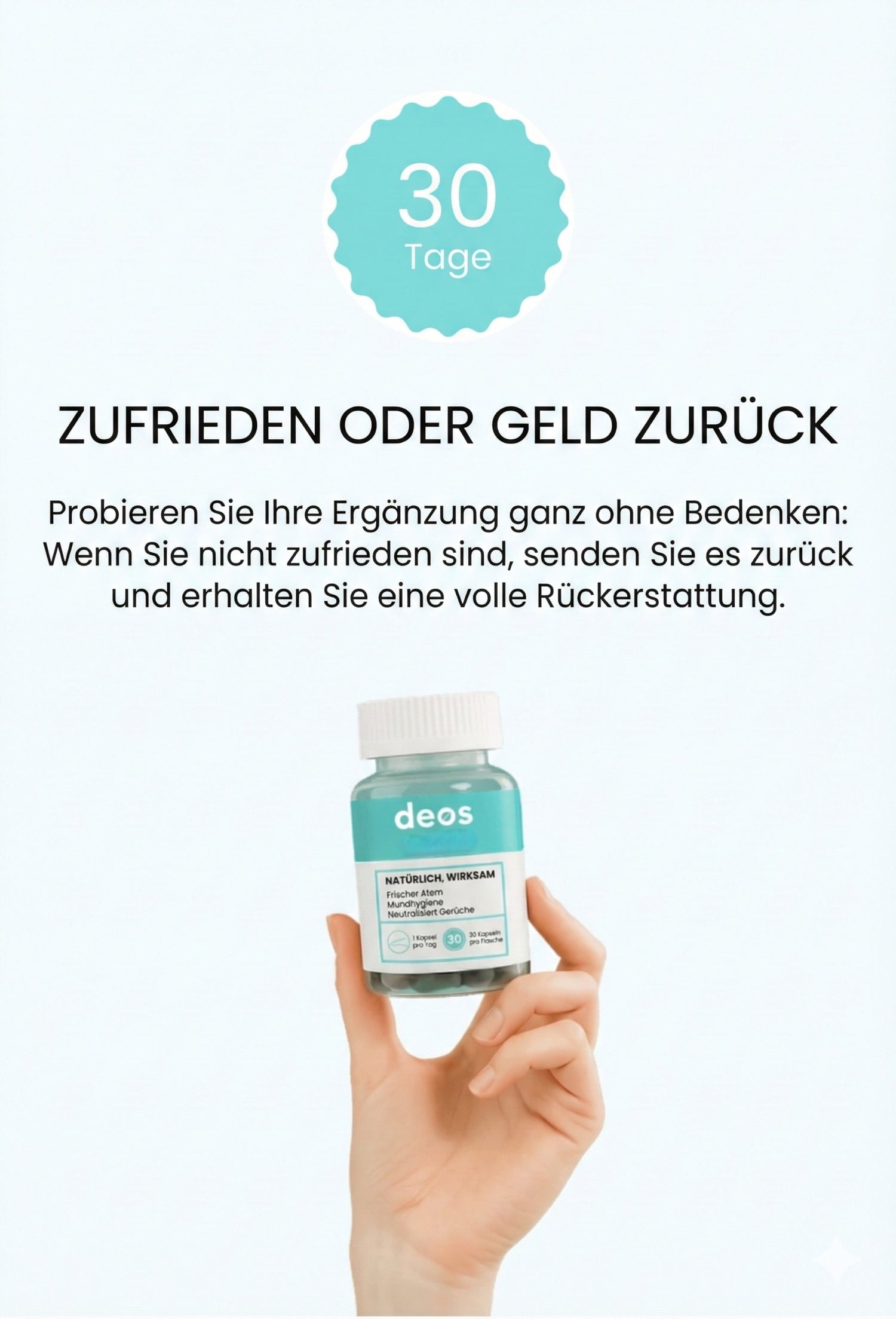 Unsere Formel bekämpft die inneren Ursachen von Mundgeruch. Wenn Sie innerhalb von 30 Tagen keine Ergebnisse sehen, erhalten Sie Ihr Geld zurück.
