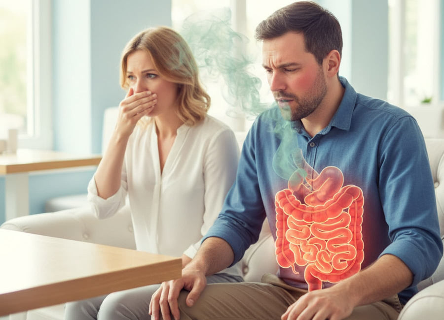 Wenn Ihre Darmflora aus dem Gleichgewicht geraten ist (durch Stress, Ernährung, Behandlungen usw.), sammeln sich schlechte Bakterien an und produzieren Schwefelgase.